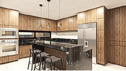 - Cocina integral equipada con: meseta de granito, gavetas de madera de Parota, estufa, tarja, horno, microondas.